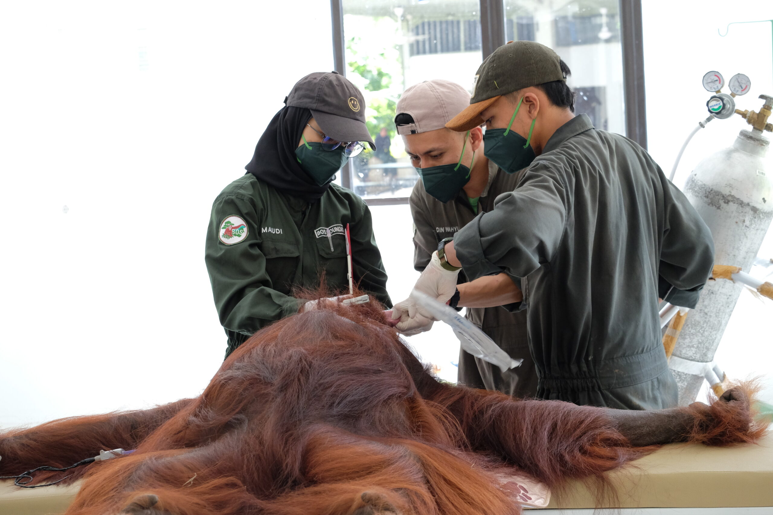 The first step is sedation, often the trickiest part, since many orangutans get nervous at the sight of the equipment. Some may even react aggressively, but with treats, gentle distractions, and quick, coordinated work from the veterinary team, the process usually proceeds without problems.